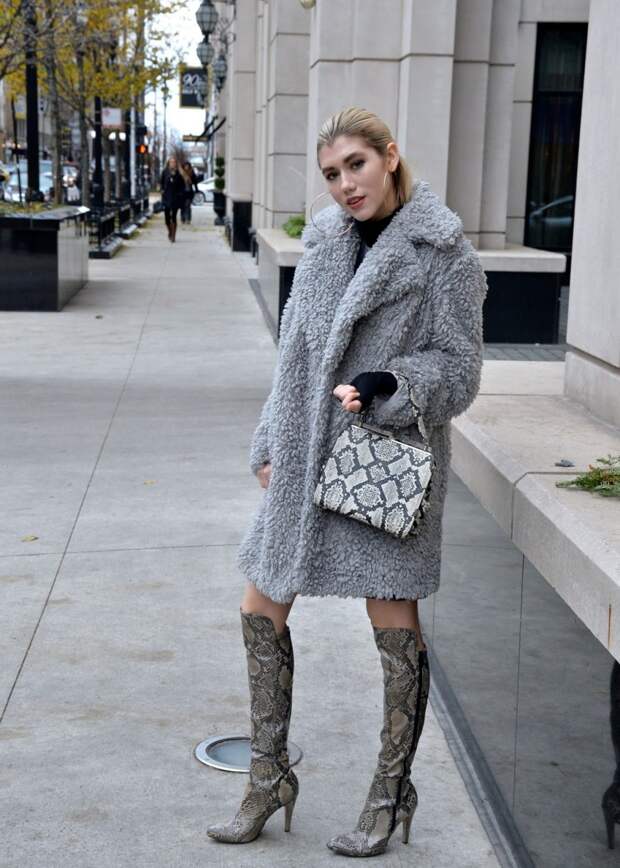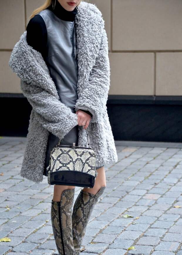 In this look I am wearing faux leather, faux fur, and faux python, that practically an entire petting zoo in one outfit; for a small girl like me that does sound a little bit crazy but its not. I started the look with a simple base of a black turtleneck (shop here) and a silver leather dress (shop similar for $15). People always ask me how I come up with my outfits, I usually say "IDK I just do" not because I am rude but because I just do! It is so simple to pick out a base look and then build from there. My next layer was these python boots (shop here on sale!), and next this vintage python bag (shop similar for $25). The pythons are different colors completely which allows them to be paired together, no fear of clashing here!