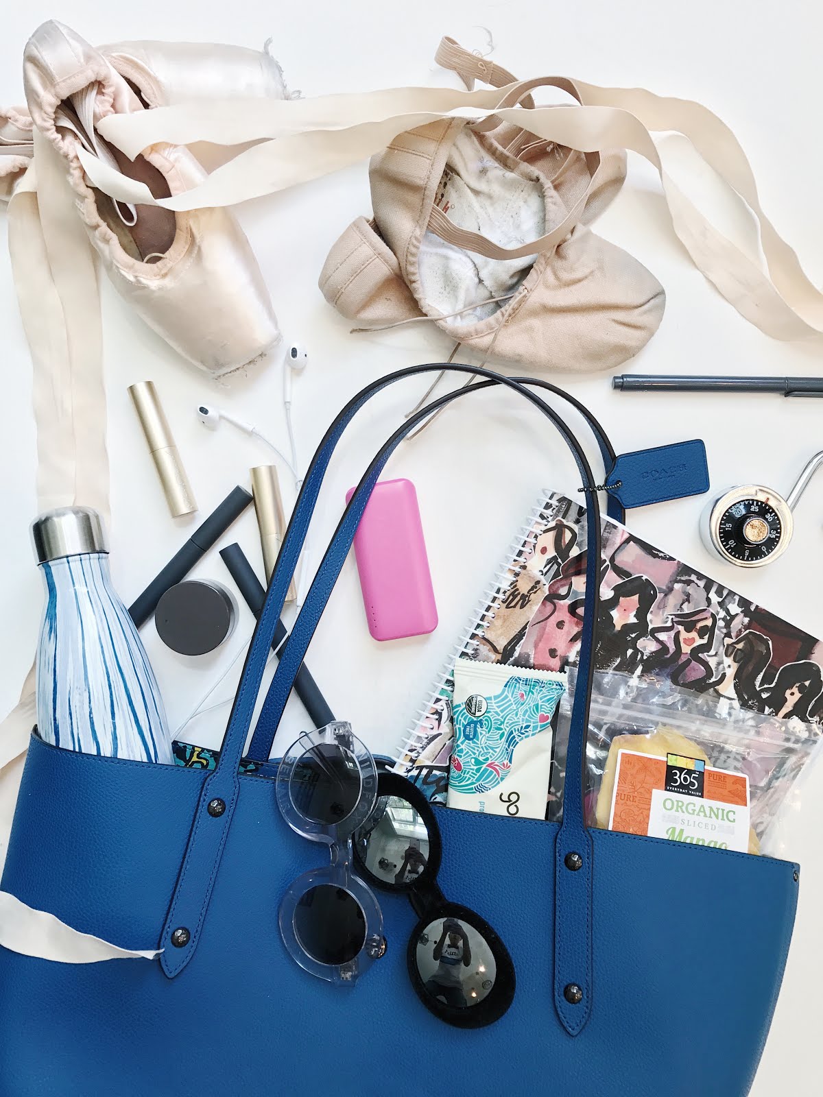 If you follow along on snapchat (danimikay), you have probably seen my dramatic "Whats in my bag?" segments. I always travel with literally everything one could possibly need, that being said my bag is always on the heavy side. I shared this photo on Instagram but I wanted to give you the full rundown here. For the Studio:Ballet Shoes - Flat and Pointe Shoes - depending on my mood. For the Gym:Earbuds - duh.A Lock - I like to keep what is mine, mine.Out and About Essentials:Portable Battery - When you have two phones and snapchat as much as I do this is a must.Four Lipsticks and a Lip Balm - again, duh.Water Bottle - I usually have one to three water bottles in my bag at any given time. Snacks - I live off of Go Macro / Lara Bars and dried mangos.Sunnies - Squinting gives you wrinklesNotebook - This book holds my entire life, I would be lost without it.A pen - Always have a pen.