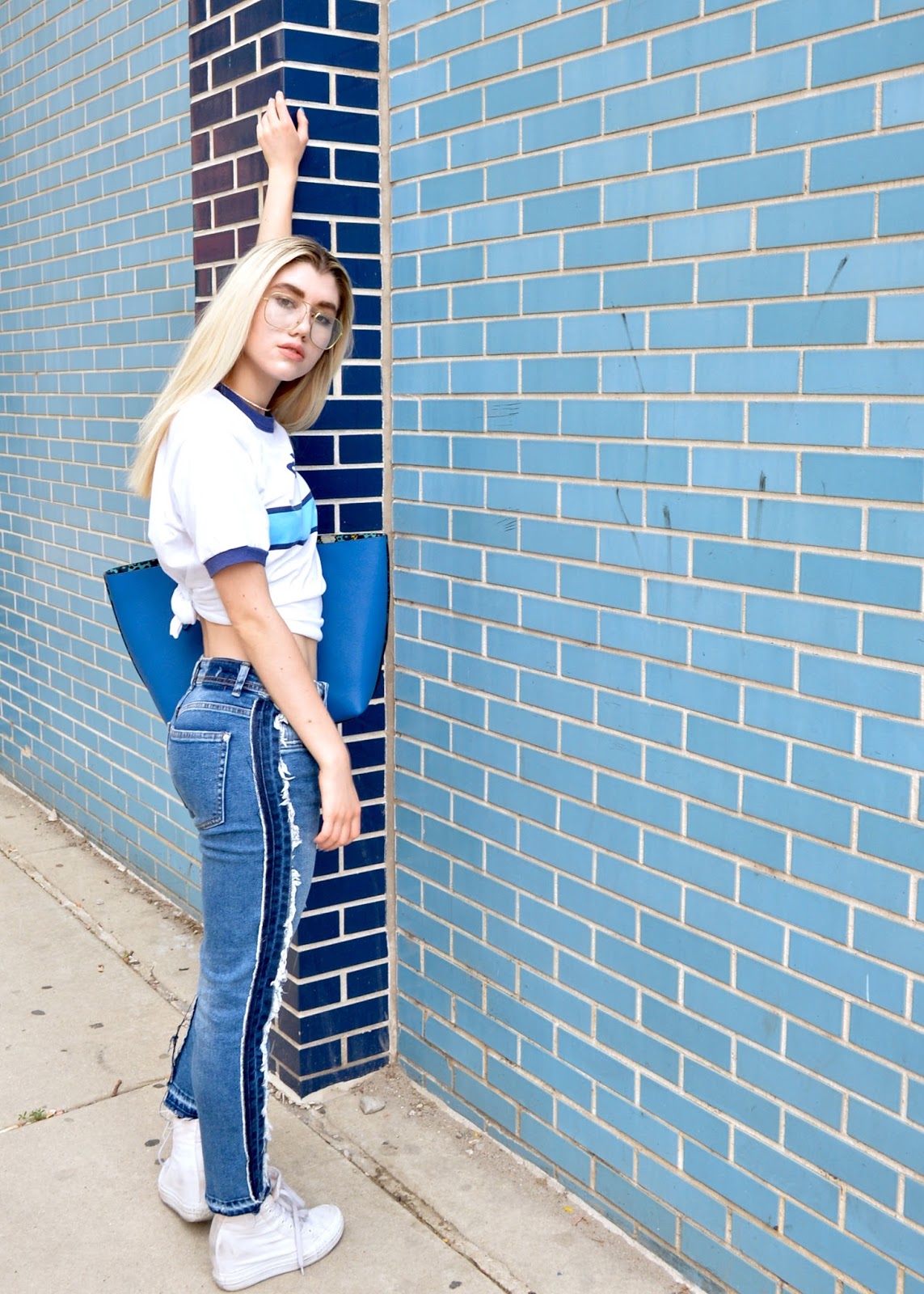 The major key to rocking a monochromatic look is finding a wall to match your look. I found this wall in West Loop completely on accident. I am pretty sure they put up this wall just as they saw me coming down the street in my blues.